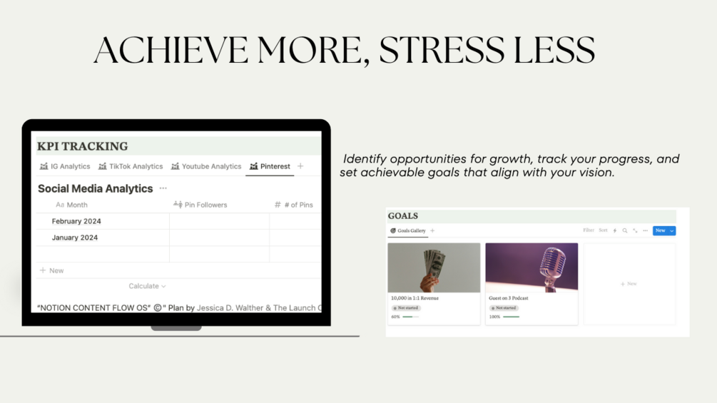 Additionally, the product includes weekly planning co-working sessions, a goal tracker to help you stay focused on goals and KPIs, and a Daily Wellness Journal and habit Tracker for holistic self-care and productivity tracking.